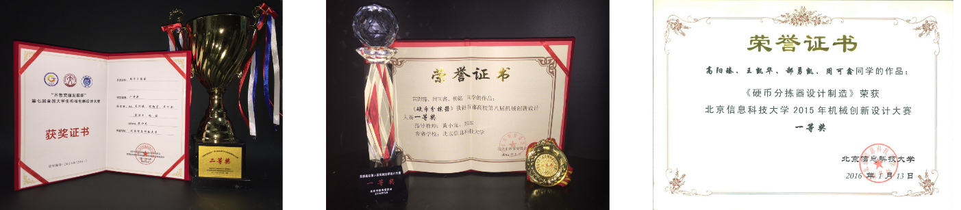 ● 获第七届全国大学生机械创新设计大赛二等奖、首都高校第八届机械创新设计大赛一等奖、北京信息科技大学2015年机械创新设计大赛一等奖